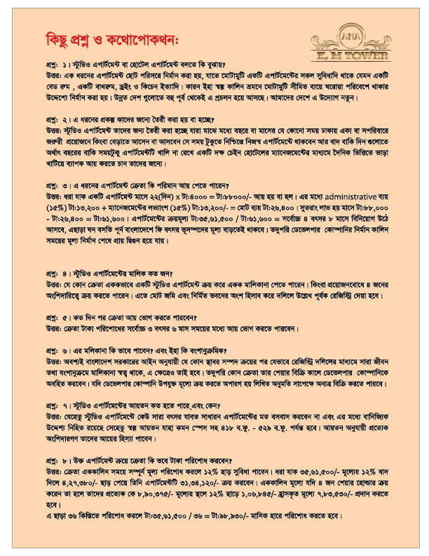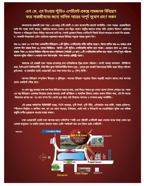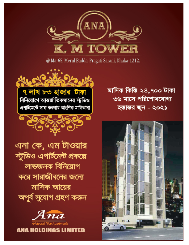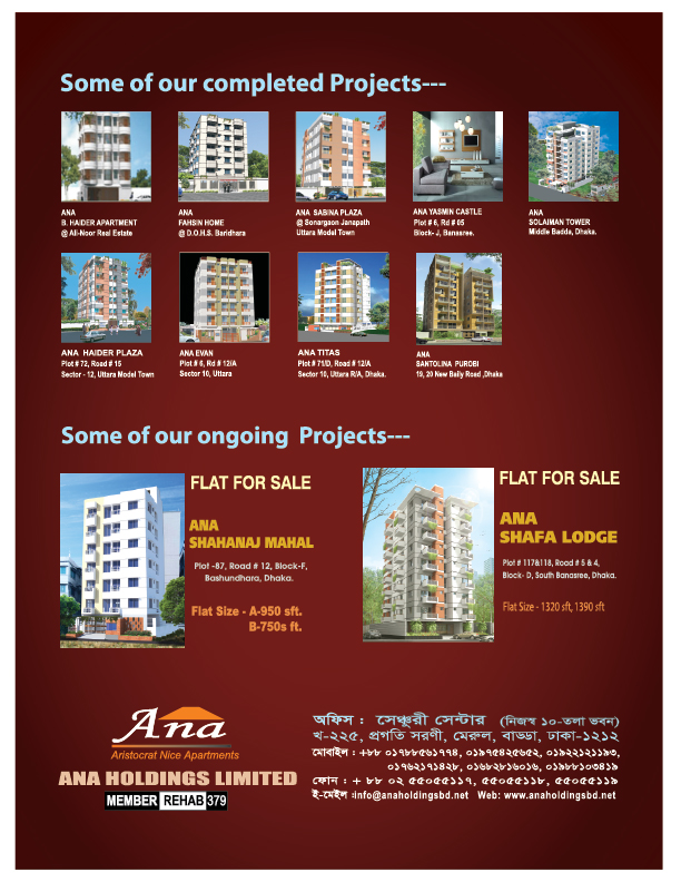 Dhaka, the fast going and expending capital city of Bangladesh need to accommodate its constantly increasing population in a descent habitable manner keeping this in mind the temperament test and limitation of our middle-income group. ANA Holding Limited plans to build up luxuries apartments with all amenities available at its fingertips.
