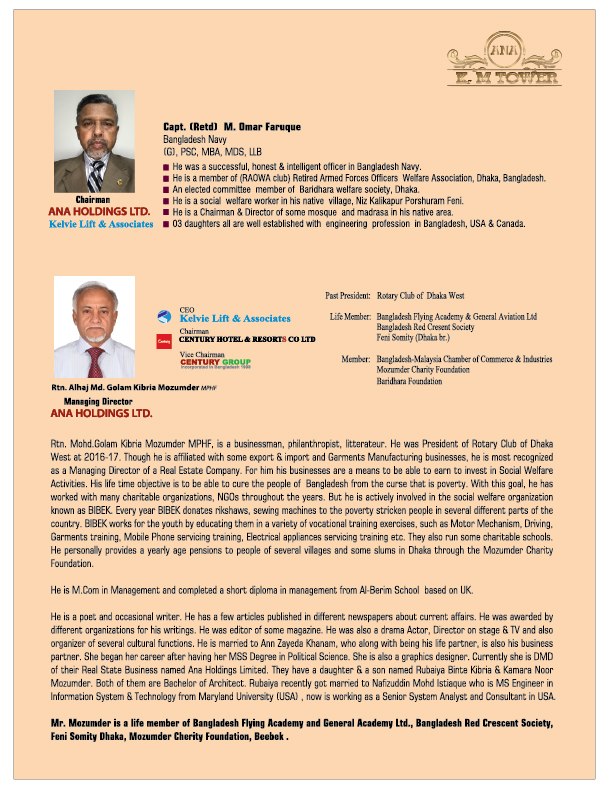 Managing Director | : | AL Haj Md. Golam Kibria Mozumder Contact: (+88) 01716-450496 |